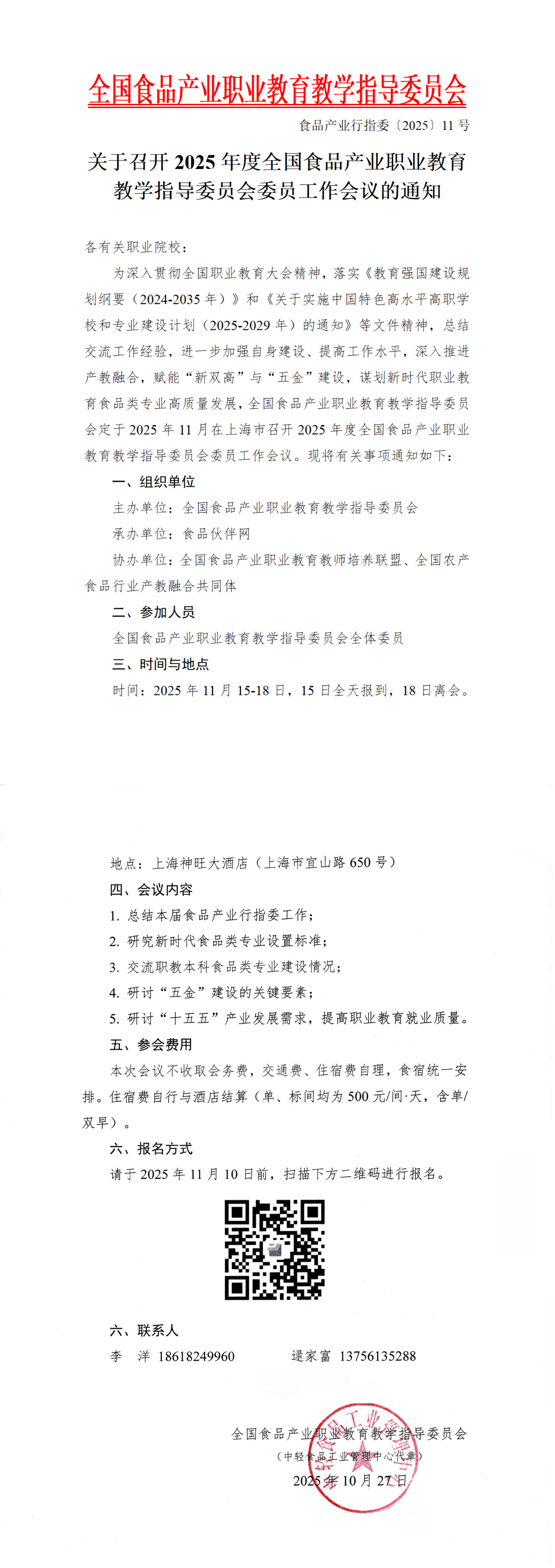 关于召开2025年度全国食品产业职业教育教学指导委员会委员工作会议的通知