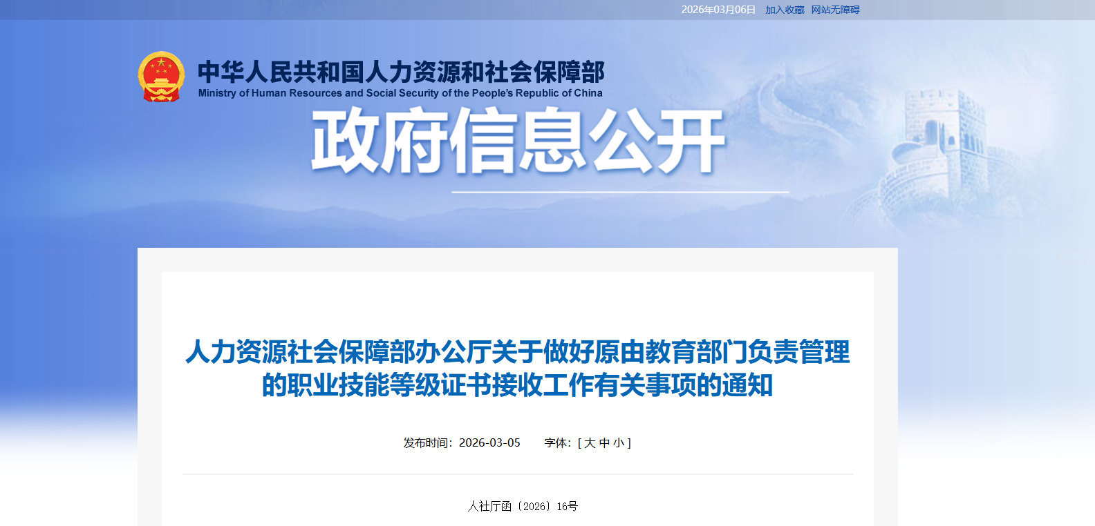 人社厅函〔2026〕16号 各省、自治区、直辖市及新疆生产建设兵团人力资源社会保障厅(局): 根据《人力资源社会保障部办公厅 教育部办公厅关于做好教育部门负责管理的职业技能等级证书移交工作的通知》(人社厅函〔2025〕154号)有关要求,特制定《人力资源社会保障部门接收原由教育部门负责管理的职业技能等级证书的工作方案》《原由教育部门负责管理的职业教育培训评价组织备案工作指引》《原由教育部门负责管理的职业技能等级证书项目与国家职业分类的对应目录》。现印发给你们,请遵照执行。 附件:1.人力资源社会保障部门接收原由教育部门负责管理的职业技能等级证书的工作方案 3.原由教育部门负责管理的职业技能等级证书项目与国家职业分类的对应目录 人力资源社会保障部办公厅 2026年2月28日