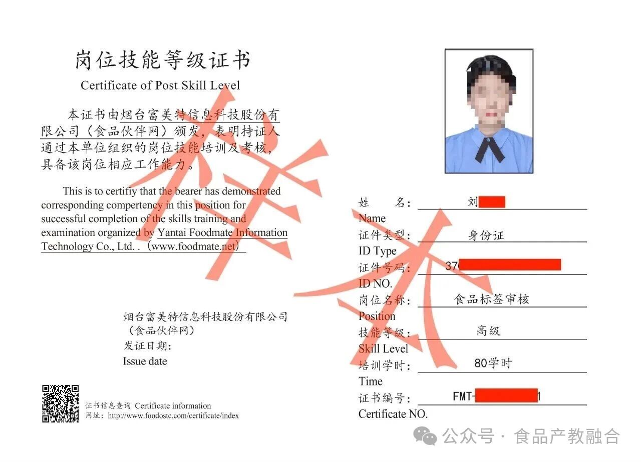 “食品标签审核岗位技能证书”是由烟台富美特信息科技股份有限公司(食品伙伴网)颁发,可在食品伙伴网证书查询中心https://www.foodmate.net/train/cert.php或食品行业职业技能培训中心网站https://www.foodostc.com/可查,同时可作为培训学时证明。