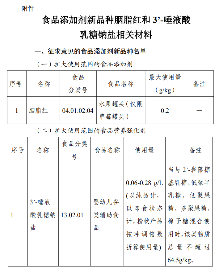 根据《食品添加剂新品种管理办法》和《食品添加剂新品种申报与受理规定》,扩大使用范围的食品添加剂胭脂红和食品营养强化剂3’-唾液酸乳糖钠盐的申请,其安全性和工艺必要性已通过专家评审委员会技术审查(具体情况见附件),现公开征求意见。请于2026年5月17日前将相关意见反馈至我中心邮箱(zqyj@cfsa.net.cn),逾期将视为无意见。