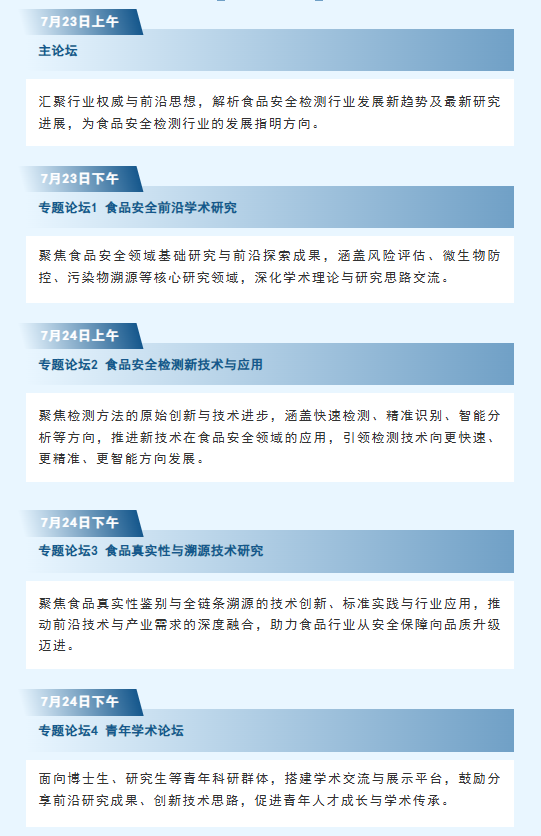参会福利:多会通票(凭任一大会门票可参加所有会场论坛) 食品安全检测学术交流会 第十六届食品微生物检测与控制技术交流会 第六届食品理化与仪器分析技术交流会 第三届食品检测实验室管理交流会 食品接触材料检测技术 食品风味分析与感官评价 食品营养成分与功能性物质检测与评价 第十一届食品质量安全管理大会 食品安全合规与风险管理 |